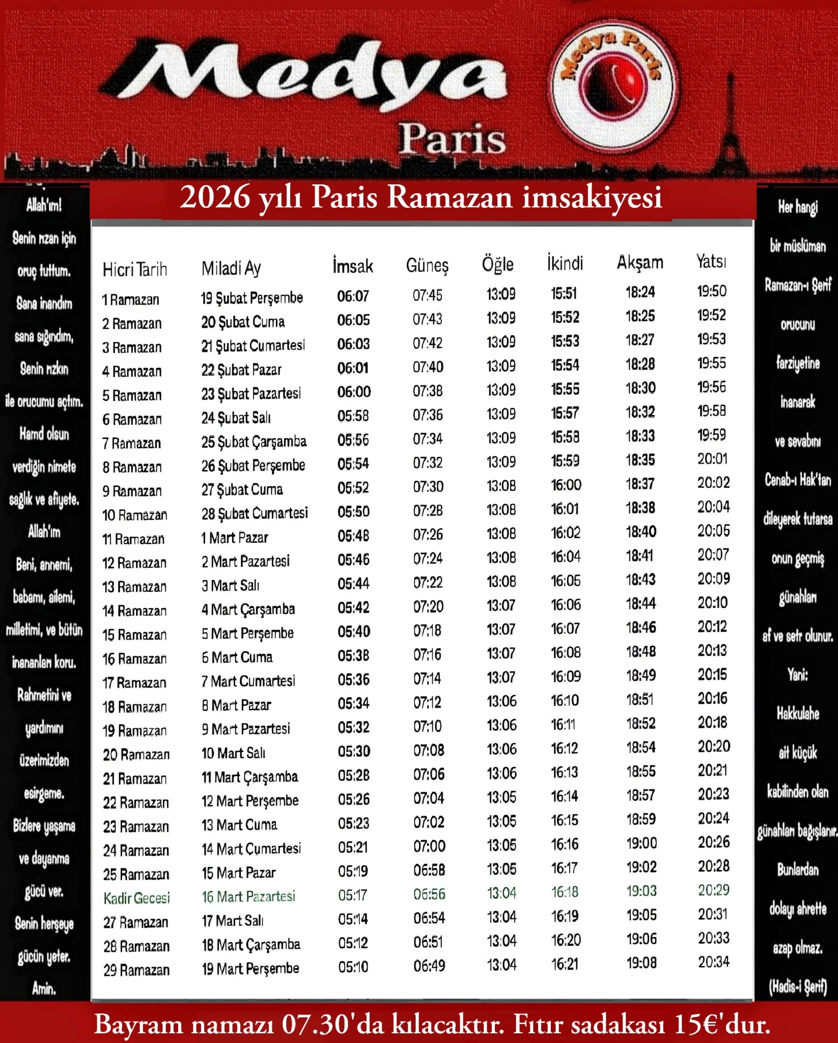 İşte Paris- 2026 Ramazan imsakiyesi