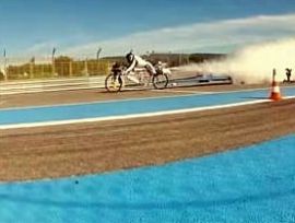 Fransız bisikletçi François Gissky inanılması güç bir şeyi başardı. Roketli bisiklet ile Ferrari arabayı geçti!Fransız bisikletçi François Gissky inanılması güç bir şeyi başardı. Youtube'da "rocketman340" profili ile hız tutkusu olduğunu açıkça belli eden Gissky bu tutkusunu bisikletle yaşıyor. 2013 yılında bisiklete sarılmış bir roket ile hızlanarak 285km /h hıza 6.7 saniyede ulaşmayı başaran Gissky, rekorunu inanılması güç bir yarış ile kırdı. 333 km /h hızı görmeyi başaran çılgın bisikletçi bunu Fransa'nın güneyinde bulunan Circuit Paul Richard isimli bir parkur da gerçekleştirdi. Rekora ait detayları aşağıdaki Youtube videosundan da görebilirsiniz. Bu roketli ultra bisikletin 560 beygir gücüne sahip bir araçla aynı enerji miktarını harcadığı söyleniyor. Bünyesinde hidrojen peroksit ile çalışan 3 ufak roket bulunduran bu bisiklete binmek için gerçekten inanılması güç bir hız tutkusuna sahip olmak gerekiyor. Videoda da görebileceğiniz üzere 650 beygirlik Ferrari 430 Scuderia ile yaptığı ufak yarışı da kazanan bu süper hızlı bisikletin yaratıcıları bulunacak bir sponsor ile bisikletin gücünü daha da ilerleteceklerini iddia ediyor. |