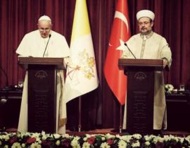 Vatikan Devlet Başkanı Papa Franciscus, Diyanet İşleri Başkanı Prof. Dr. Mehmet Görmez’i ziyaret etti.![]() Diyanet İşleri Başkanı Mehmet Görmez ve Papa Franciscus'dan ortak açıklama Katolik dünyasının ruhani lideri ve Vatikan Devlet Başkanı Papa Franciscus, Diyanet İşleri Başkanı Prof. Dr. Mehmet Görmez’i ziyaret etti. Mehmet Görmez, makamında Franciscus ile bir süre görüştükten sonra Papa Franciscus ile ortak basın açıklamasında bulundu. Konuşmasına ,"Allah’a hamd ederek, Yaratıcımızın Selâm adını... huşû ve ta’zimle anarak sözlerime başlıyorum" ifadeleriyle başlayan Mehmet Görmez, "İnsanlığı karanlıklardan aydınlığa çıkaran Allah’ın kutlu elçilerine, Hz. Âdem’e, Hz. Nuh’a ve Hz. İbrahim’e, insanlık tarihinin eşiklerinde her biri rehber olan Hz. Musa’ya, Hz. İsa’ya ve Hz. Muhammed Mustafa’ya salat ve selam olsun" dedi. Papa Franciscus'a "Dinlerin ve medeniyetlerin kadim yurduna, bir arada yaşamanın engin tecrübesine sahip esenlik ülkesine, dünyadaki tüm Müslüman kardeşlerinin hizmetinde olan Diyanet İşleri Başkanlığı’na hoş geldiniz" diyen Görmez, bu coğrafya, dün olduğu gibi bugün de farklı dillere, dinlere, mezheplere ve anlayışlara ev sahipliği yaparak insani değerlerin egemen olduğu; hak, hukuk ve adalet çerçevesinde herkesin barış içinde yaşadığı bir medeniyeti temsil ettiğini söyledi. "Ülkemiz bütün ilahi dinlerin mensuplarını hiç bir ayrım yapmadan yaşattı" Görmez, "Bu medeniyet, herkesin aklını, dinini, canını, malını ve nesebini mukaddes ve aziz kabul eder. İnsanın hak ve onurunu her şeyin üstünde tutar. Hiç kimsenin dilinden, ırkından, dininden, mezhebinden ve düşüncesinden dolayı hak mahrumiyetleri yaşamasını asla kabul etmez. Bütün ilahi dinlerin mensuplarını tarih boyunca hiçbir ayrıma maruz bırakmadan, birlikte yaşatan ülkemizde, farklılıkların kolayca ötekileştirilmek istendiği ve korku duvarlarının örüldüğü bugünün dünyasında, Katolik dünyasının ruhani liderini ağırlamanın, kendiliğinden özel bir anlam taşıdığı muhakkaktır" diye konuştu. "Her vicdan sahibi, insanlığın sürüklendiği bunalım karşısında emaneti gözetememenin ağır yükü altında kalmıştır" "Rabbimiz Allah’a şükürler olsun ki, bizi maddenin zindanından mananın afakına, masivaya ubudiyetten, inayetinin aydınlığına eriştirdi" diyen Görmez, sözlerini şöyle sürdürdü: "O, kutlu elçileriyle merhamet ve selamet müjdesi indirdi. Dalalet ve karanlığın karşısında hidayet ve aydınlığı bahşetti ve bizi iman ve samimiyete, ihlâs ve sadakate, iffet ve adalete davet etti. Bu davet tüm insanlaraydı. Fakat biz insanlar, özellikle birkaç asırdır bu ilahi davetin kıymetini hakkıyla takdir edemedik. Bu yüce emaneti muhafaza etmede acze düştük, tabiatın dengesini bozduk ve nihayet dünyayı kendi ellerimizle felaketlerin eşiğine getirdik. Bu felaketlerin nedenini sadece bir takım odaklara ve şer güçlere yıkamayız. Hayır! Açıkça ifade edelim ki, bu hepimizin ortak vebalidir. Hiç kimsenin bu sorumluluktan kaçması mümkün değildir. Hangi dine mensup olursa olsun her vicdan sahibi, insanlığın sürüklendiği bunalım ve kargaşalar karşısında emaneti gözetememenin ağır yükü altında kalmıştır. Rabbimizi unutarak, O’nu yok sayarak konuşanlar kadar; O’nun adına konuşanlar, Tanrı edasına bürünenler, O’nu kâh kelimelere boğarak hapsedenler, kâh konuşulması gereken yerde susanlar, hep birlikte bu cürme ortak olmuşlardır." Dünyanın bugün, açlığın, sefaletin ve adaletsizliğin; katlanarak büyüyen hukuk ihlallerinin; insan haysiyetini ayaklar altına alan ve kadın-çocuk ticareti dâhil kirli ticaretlerin; tahammül edilemez boyutlara ulaşan çatışma, terör, katliam, savaş ve insanlık suçlarının pençesinde olduğunu vurgulayan Görmez, "Bütün bunlar olup dururken hangi insaf sahibi yürek, masum olduğunu iddia edebilir? Hangi dine mensup olursa olsun, kim bu vahim tabloda payı bulunmadığını iddia edebilir?" sorusunu yöneltti. "Müslüman toplumların tüm birikimleri hunharca yok ediliyor" Modern zamanların esas felaketinin, küreselleşmiş çıkarların, halkları maddeperest despotizmlere ve tiranlıklara mahkûm etmesi olduğunu belirten Görmez, "Her biri insanlığa bahşedilmiş ilahi nimetler olan doğal kaynaklarımız, ihtiras sahiplerinin elinde nice masum insanın hayatına mal olmaktadır. Günümüzde, Afganistan, Arakan, Irak, Nijerya, Suriye ve Somali başta olmak üzere Müslüman toplumların tüm birikimleri hunharca yok ediliyor ve kaynaklarının sömürülmesi gözlerden gizleniyor. Özellikle Müslüman coğrafyalarda bir şiddet ve vahşet sarmalı insanlığı ayaklar altına almakta, bu coğrafyalarda Müslüman olsun ya da olmasın herkes büyük acılar yaşamaktadır" ifadesini kullandı. "Şiddet ve vahşet yayanlar Allah'a isyan halindedir" İslam Dini'nin barış dini olduğunu kaydeden Görmez, "Bir barış çağrısı olan İslâm’ın mesajına tamamen aykırı bir yola saparak şiddet ve vahşet yayanlar, kendilerini nasıl adlandırırlarsa adlandırsınlar Allah’a isyan halindedirler. İnsan insana muhtaçtır ve insan insana emanettir. İnsan insanın kurdu değil, yurdudur. Bu emanete sahip çıkmamak kabul edilemez bir aşırılık ve tuğyandır. Müslümanlar olarak böylesine bir aşırılığı ve kıyımı şiddetle reddediyoruz." dedi. "Filistin'de yaşananlar için derin ıstırap duyuyoruz" Son günlerde Filistin’de barış umutlarını söndüren gelişmeler yaşandığını vurgulayan Görmez, "Bütün Müslümanlarla birlikte bizler de bu gelişmelerden derin bir ıstırap duyuyoruz. Özellikle ilahi dinlerin ortak mukaddesi olan Mescid-i Aksa’nın ismet-i harimine ve mazlum Filistin halkına yönelik tecavüz, insanlık adına derin bir hica