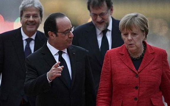 Avrupa Birliği’nin (AB) temellerinin atıldığı Roma Antlaşması’nın 60’ıncı yıldönümü öncesi Fransa’nın ev sahipliğinde mini bir zirve düzenlendi. Fransa Cumhurbaşkanı François Hollande, Versailles Sarayı’nda Almanya Başbakanı Angela Merkel, İspanya Başbakanı Mariano Rajoy ve İtalya Başbakanı Paolo Gentiloni’yi kabul etti. Mini zirve sonrası Avrupalı liderler ortak mesajlar verdi.