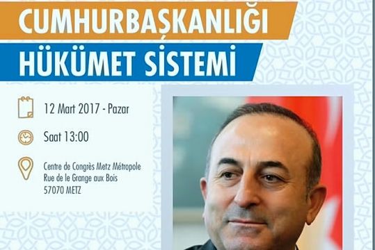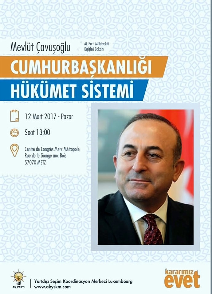 Dışişleri Bakanı Mevlüt Çavuşoğlu 16 Nisan 2017'de gerçekleşmesi planlanan 2017 Türkiye anayasa değişikliği referandumunda Metz'de 'Neden Evet, niçin Evet' demek gerektiğini anlatacak.
