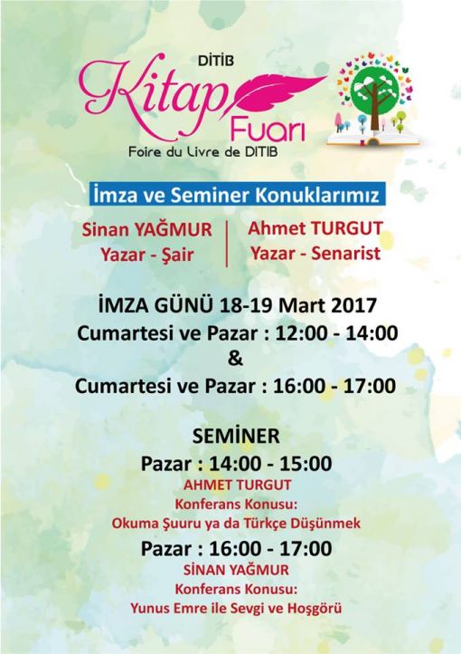 Türkçe ve Fransızca kitaplarla her yaşa hitap eden kitap fuarında senarist, yazar Ahmet Turgut ile şair ve yazar Sinan Yağmur imza ve söyleşi programında kitapseverlerin karşısına çıkacak. İki yazar ayrıca “Okuma şuuru ve Türkçe düşünmek”, “Yunus Emre ile sevgi ve hoşgörü” başlıklı birer de seminer verdi.