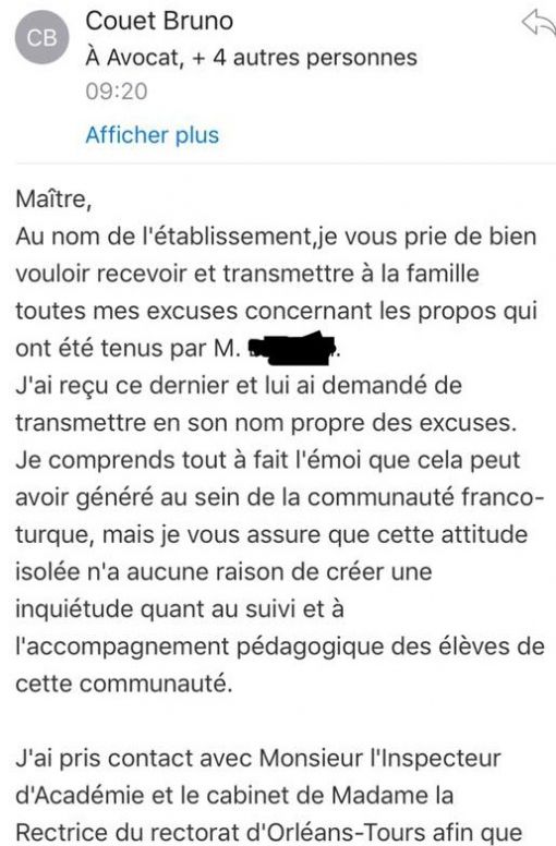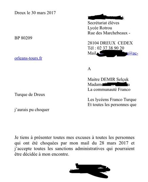 Dreux’daki Rotrou Lisesi’nde okuyan Türk öğrenci, Türkiye’de üniversiteye başvurmak için okuldan denklik belgesini istemiş. Ancak kendisine okuldan gönderilen maille büyük şok yaşamışdı. Skandal maile maruz kalan Türk öğrencinin de avukatlığını üstlenen Selçuk Demir ”Hakkımızı arayacağız, Sonuna kadar bu konunun takipçisi olacağız !”diye konuşmuştu. Aradan 24 saat geçmeden birkaç saat içimde Skandal mail'den sonra okul yönetiminden özür geldi. Türk öğrencinin de avukatı Selçuk Demir "Bu dava gösteriyor ki, ırkçılık, ayrımcılıkga ve Türk düşmanlarına karşı hep birlikte hareket edip ortak tavır gösterirsek hep beraber harekete geçildiginde, çok şeyin değişebilecegini bu yaşanan veciz olay bizlere somut bir şekilde ortaya koymuştur." dedi.