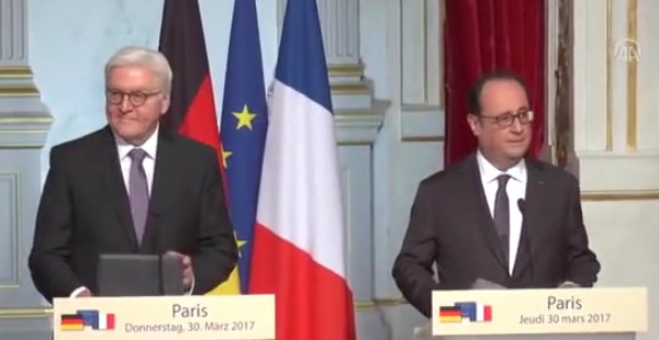 Frank-Walter Steinmeier ise François Hollande ile dünya genelinde yükselen otoriter yaklaşımların artması karşısında meydana gelen iç çatışmalar dahil birliği ilgilendiren iç ve dış sorunları görüştüklerini söyledi.