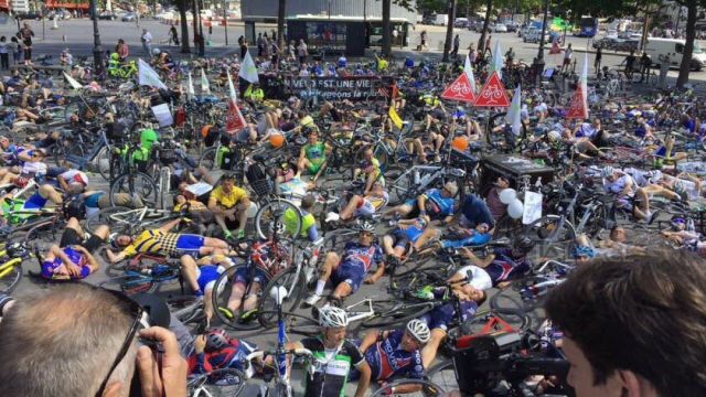 Bastille meydanına gelen amatör ve profesyonel bisikletçiler, burada bisikletlerinin yanına uzanarak, yollardaki trafik kazalarında yaşamını yitiren arkadaşları için sembolik saygı duruşunda bulundu.